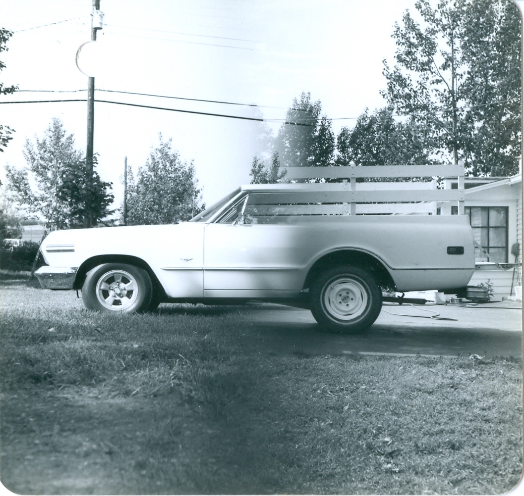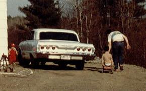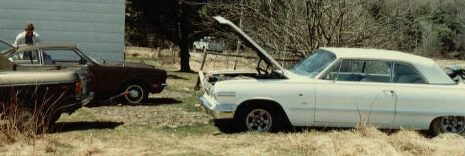 This is my dad's Brat pulling the car from our back yard. You can see my uncle beside his Vega in the shot below.