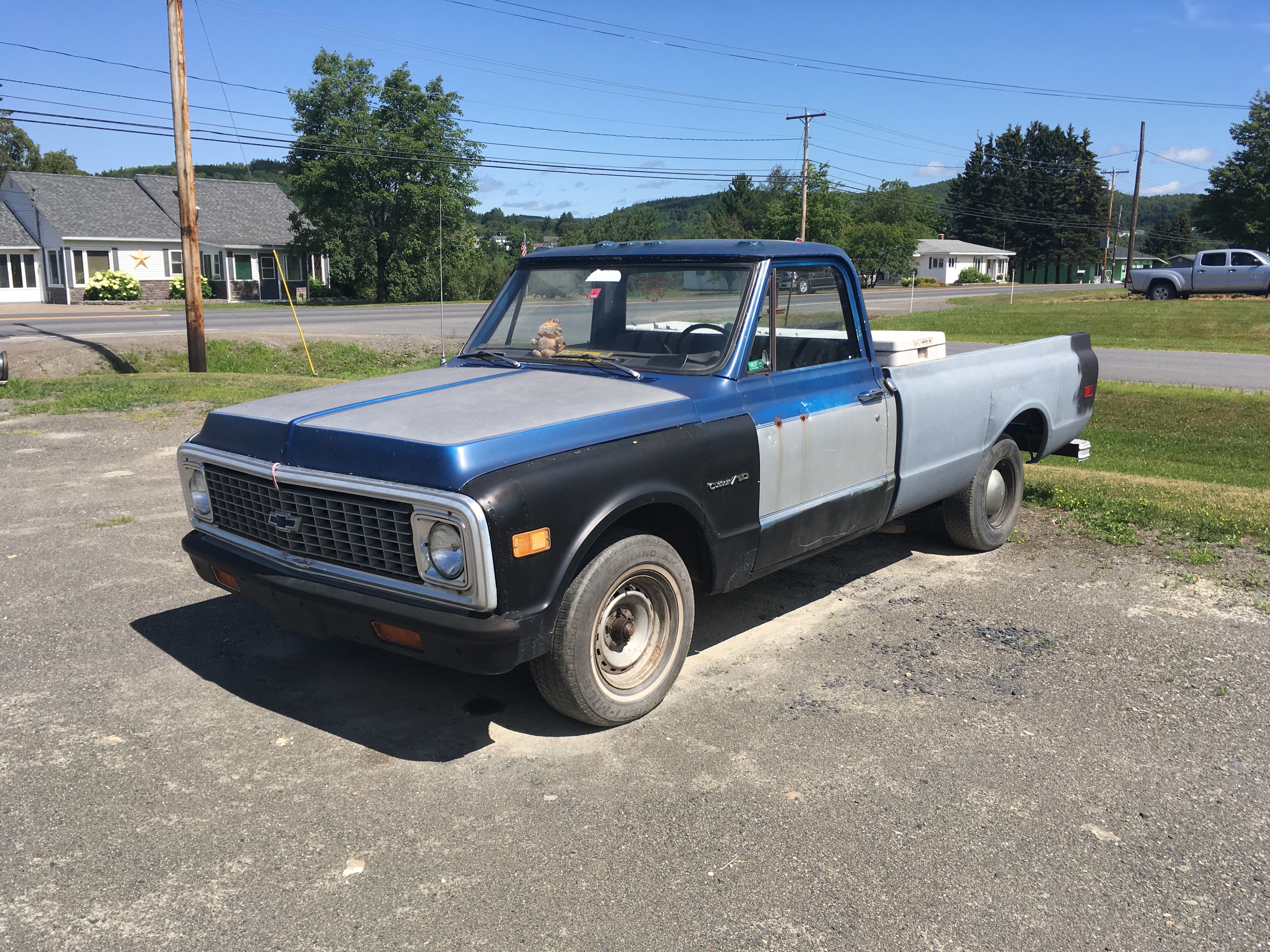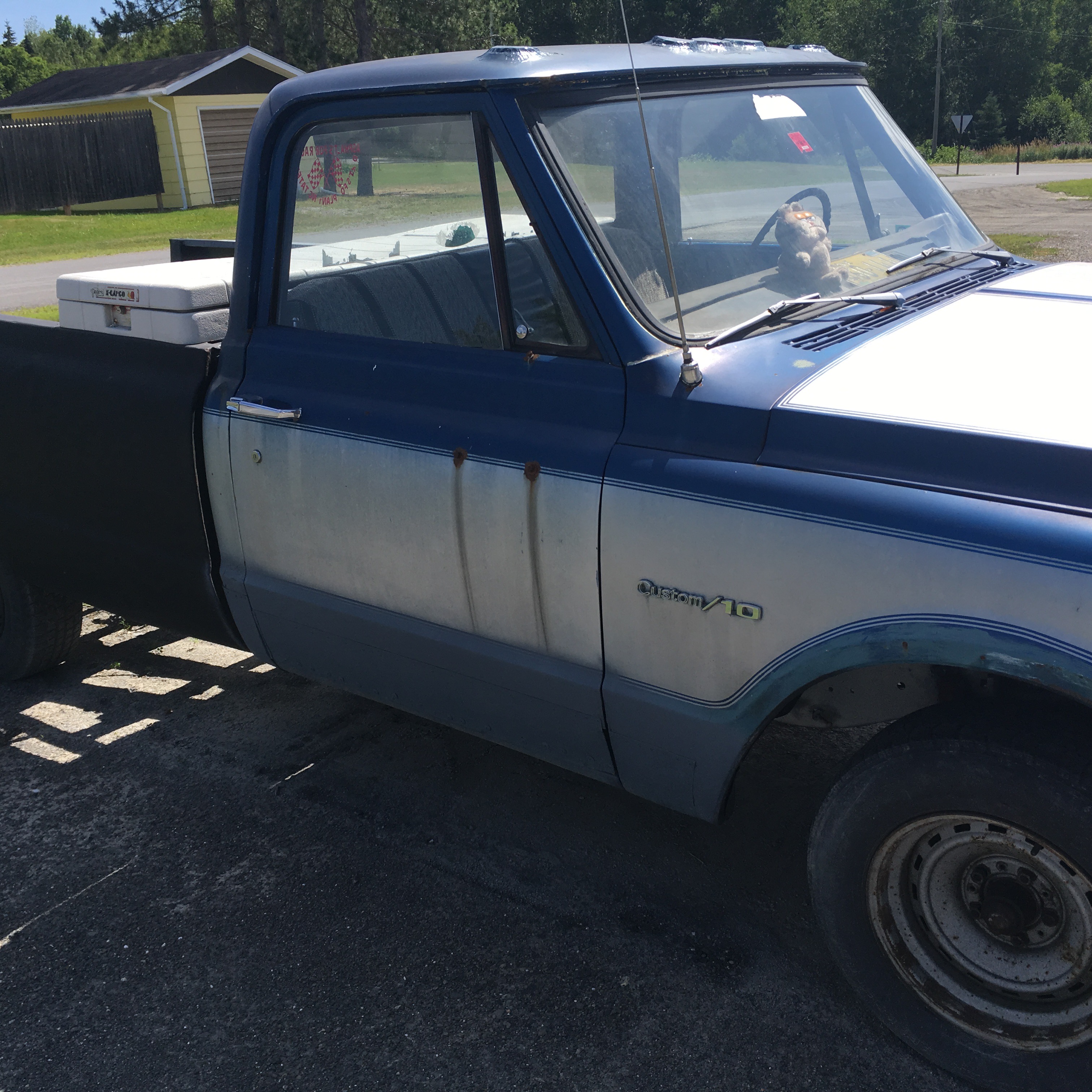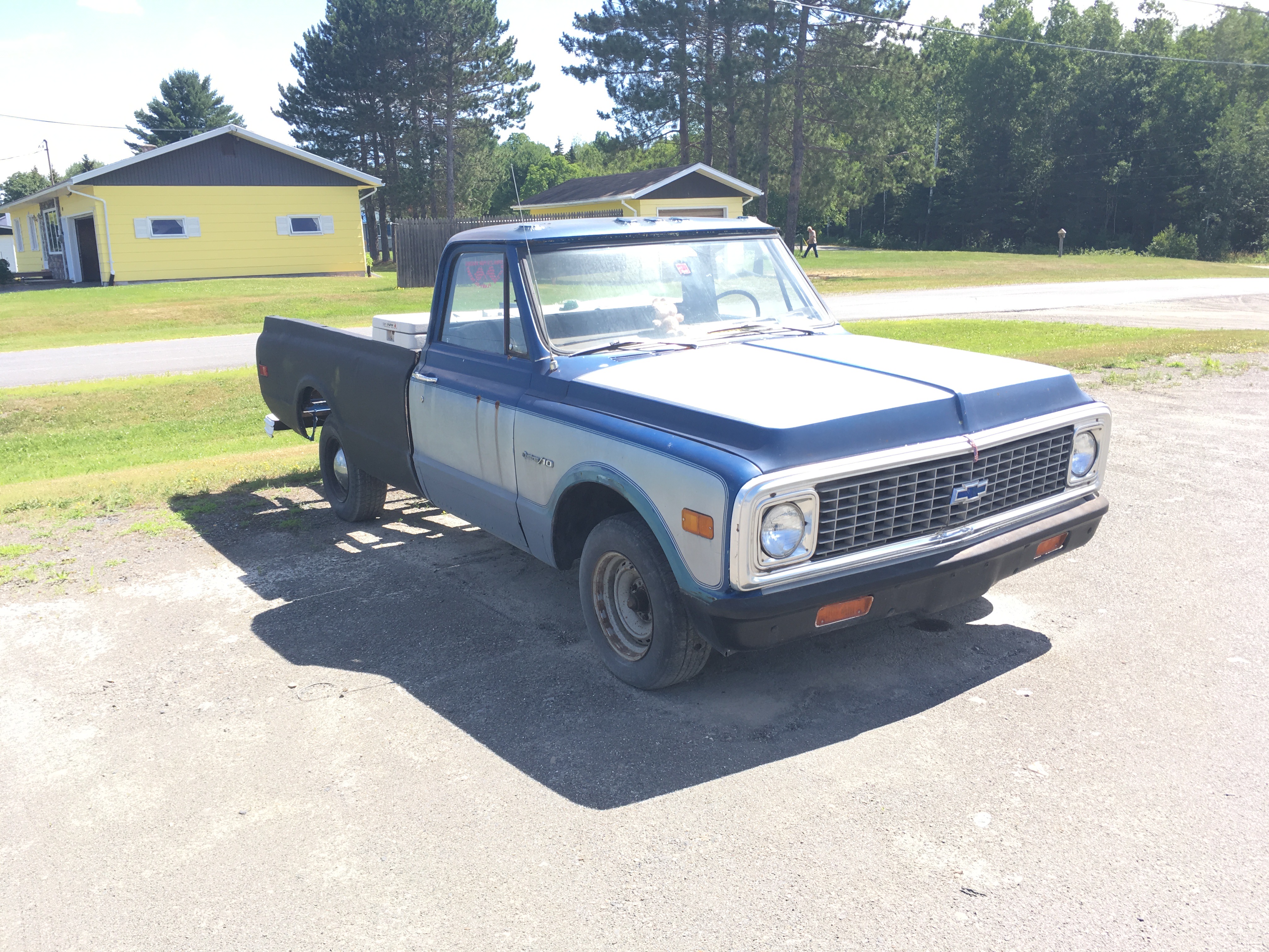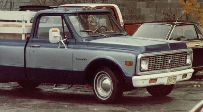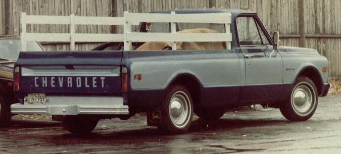 This was my grandfather's Pickup truck. It was bought in 1973 with 90,000 miles on it. It was originally used to haul canoes to California. It had a 307 V8. The pictures below show the truck after it had been painted by my father from a yellow to the two tone blue.
