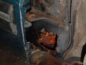 Here is a section of the A post. This is just below the lower hinge and is one of the reasons for replacing the rocker panel. When we removed the rocker panel, we must have pulled about 5 lbs of rust and dirt from the rocker. Continue on by clicking the link below.