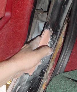 As shown a few pictures up, a good size hole was found in the door post. That was filled with Tiger Hair (a reinforced body filler) and also prepped with body filler.
