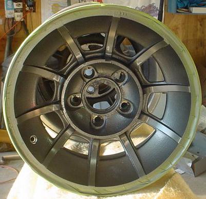I don't have any pictures of them when I got them, but I spent about 12 hours total cleaning them up. I started with a course steel wool and worked my way up to a scotch bright pad. I polished 2 of them with my dremel, but they came out too shiny. By this point, I had repainted my truck and started my Turbo Regal Clone project. I needed to bring the black down to aluminum, but the paint on these wheels wouldn't budge. After trying one in bright silver, I decided to go with the center body color, Astral Silver (darker). Below is a shot of a just been painted taped wheel.