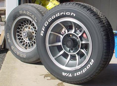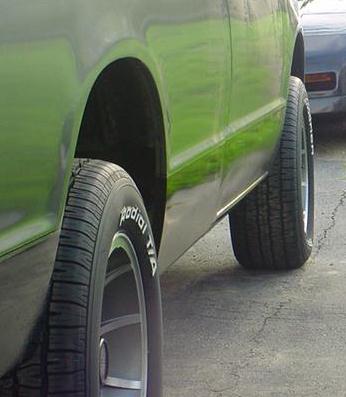 The center of the wheel is normally aluminum but they were so dirty and hard to clean I painted them too. With the wheels set, I needed tires. No problem here, my Buick has BF Goodrich Radial TA's...they must go on. Below is a picture of my truck wearing my Buick's wheels and tires...