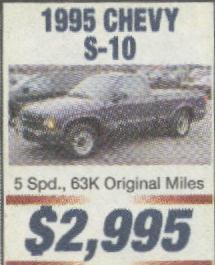 Here is Larry's Brand New Used Chevy S-10. I'm sure we're all glad to welcome him back to the GM family. Below is the truck as advertised in the Bangor Daily News. Larry was able to use is expert negotiation skills and talk them down to $2800. It has a 2.2L SFI 4 Cyl and a 5 speed with 63,000 miles.