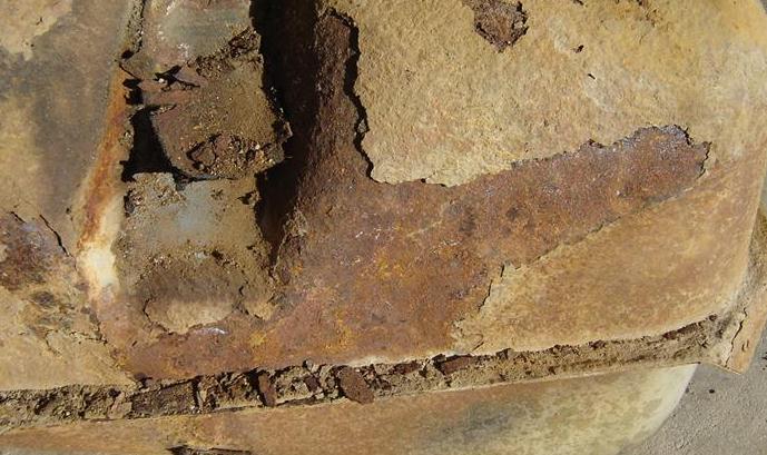 Below, just a sample shot. We're mostly dealing with surface rust, anywhere where moisture was allowed to sit is worse, so under some of the bed paint and edges are worse then flat panels. This should all be scraped down and treated. The tank is in this picture, driver's side, facing forward from the wheel well.