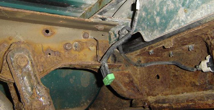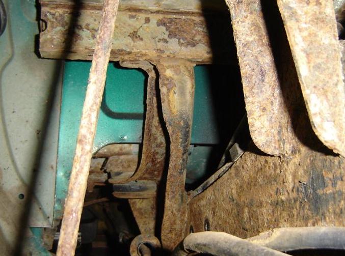 Above is a sheet metal crossover on the bed, below is the right rear of the truck. The bumper is on the right with the white plug being for the rear licence plate. The item on the left is the rear spring shackle.