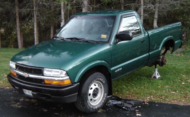The next 2 phases are almost one...spray chassis cleaner "Marine Clean", allow to dry over the day, then spray "Metal Ready" an acid to help the POR-15 stick. Parked the rear of the truck over the lawn so the cleansers and dirt won't harm the driveway. Old wheels are still on the truck.