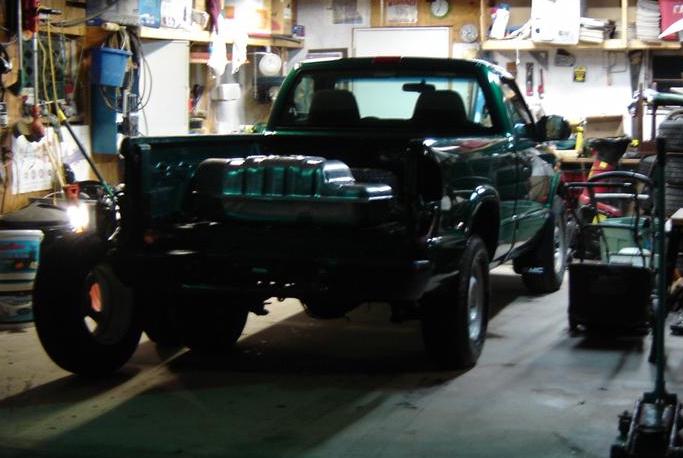 Pushed back into the garage to dry for the final time. I also washed the truck so I can start polishing the paint while the chassis paint dries. This meadow green metallic should glow in the dark with a little care. It currently has ZERO wax on it. New tires are to the left and the fuel tank was cleaned and etched too.